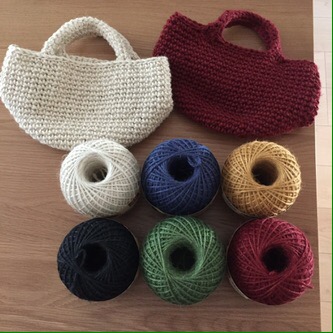 写真でご確認ください。当日選ぶことも可能です。麻ひもでザクザク編んで作る麻ひもバッグです。大羽ミシンさんのミシンも使い、内布も縫って仕上げます。初心者様でも、ゆっくりご自分のペースで、編んで頂けます。